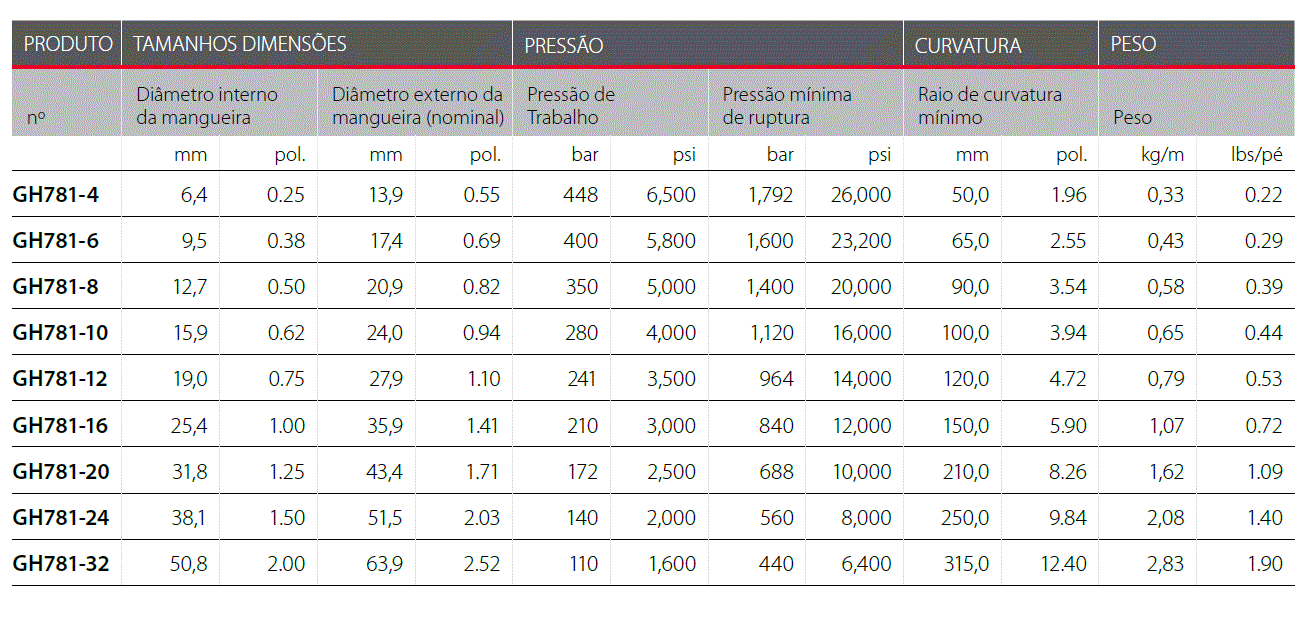 Indicada para uso em sistemas hidráulicos em geral, onde a pressão, temperatura, raio de curvatura e demais especificações atendam os requisitos da mangueira.